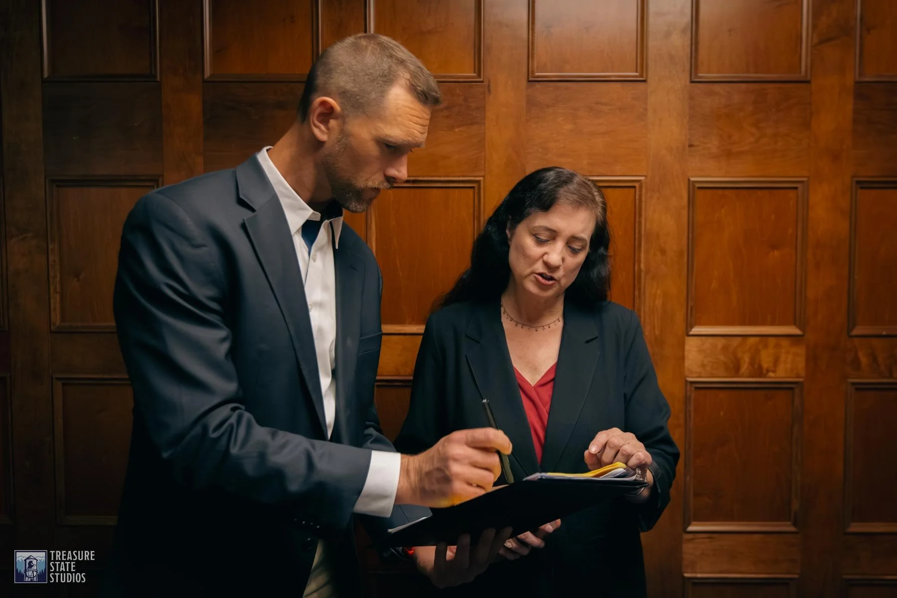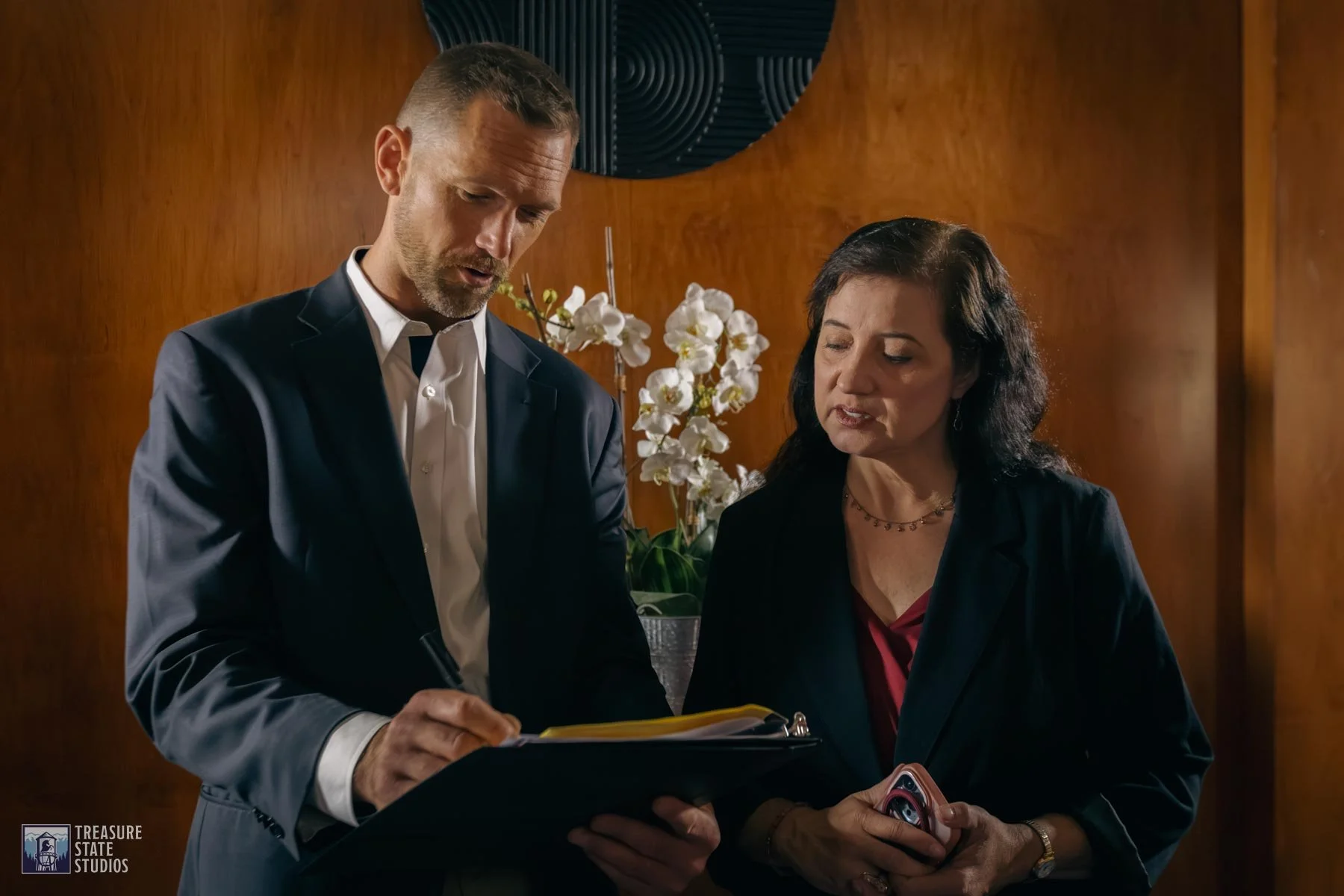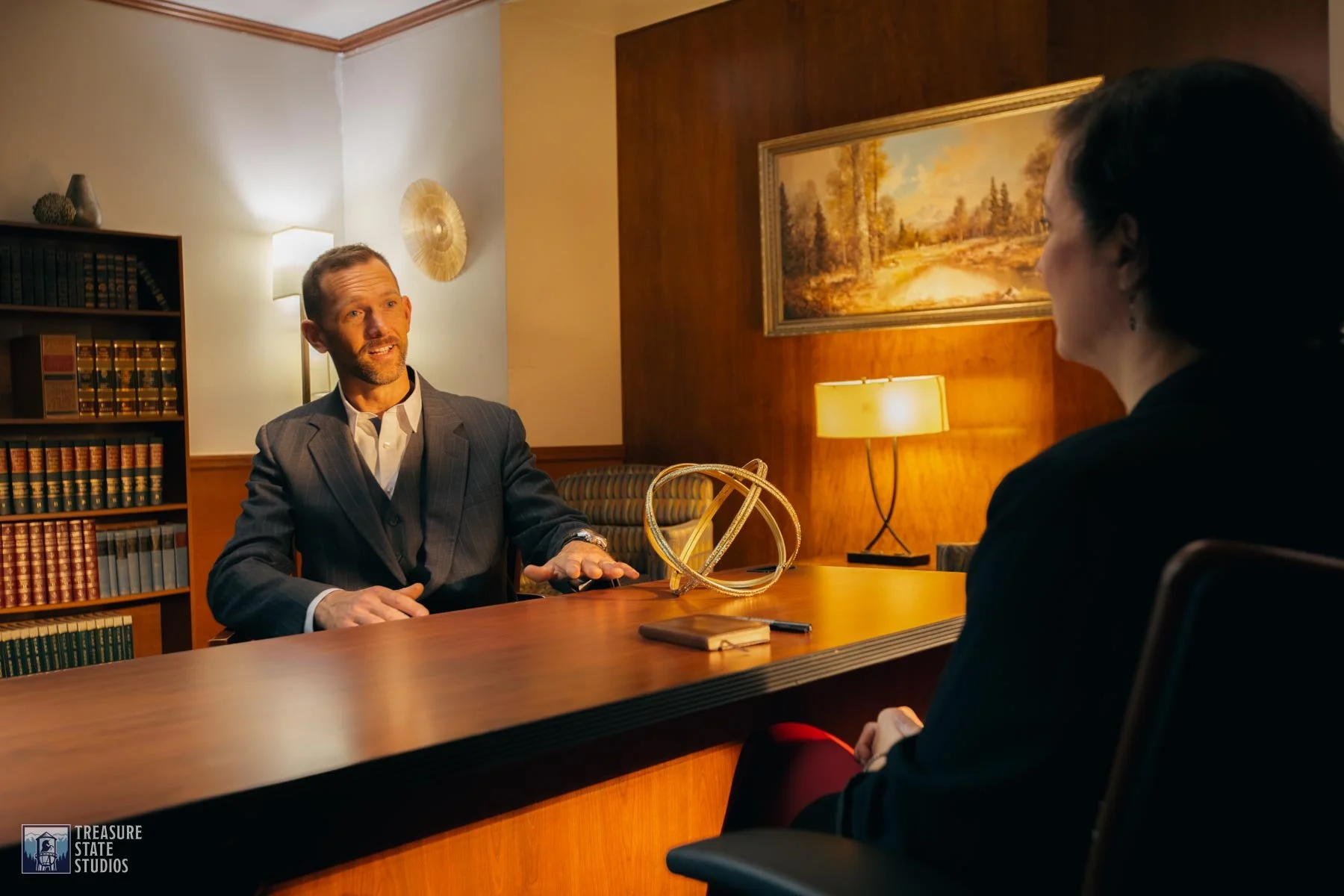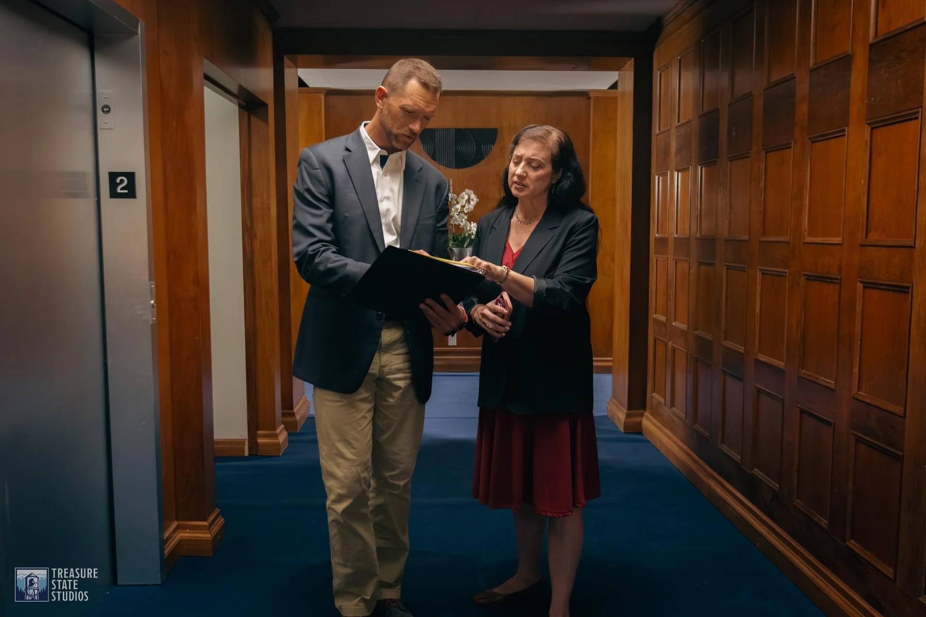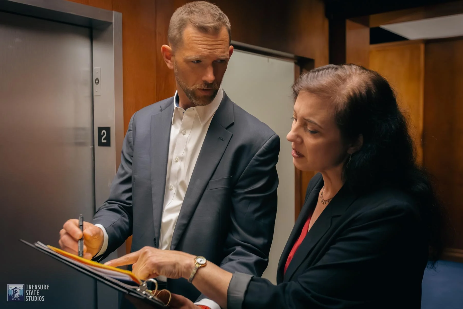 The custom elevator façade provides a striking backdrop for transitions, conversations, or dramatic reveals—adding realism and versatility to any executive office shoot.