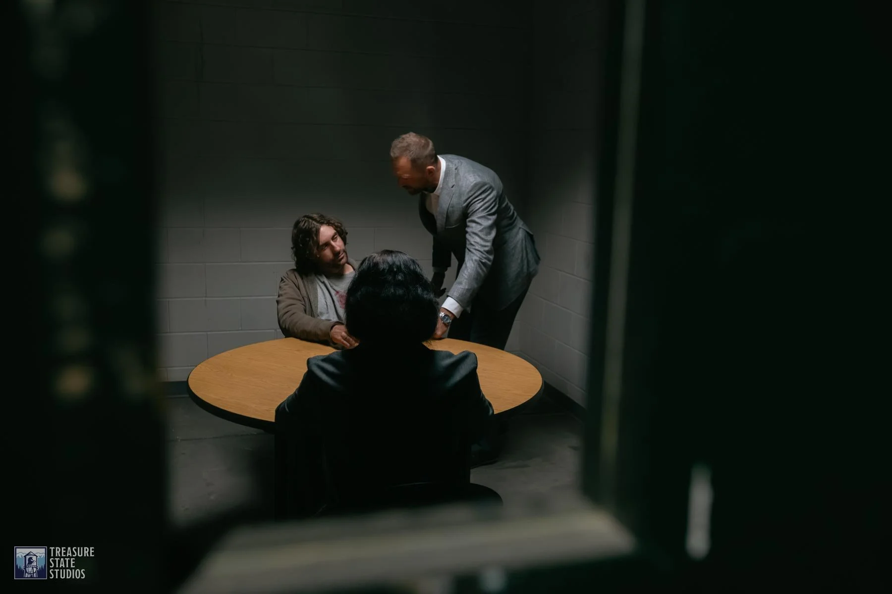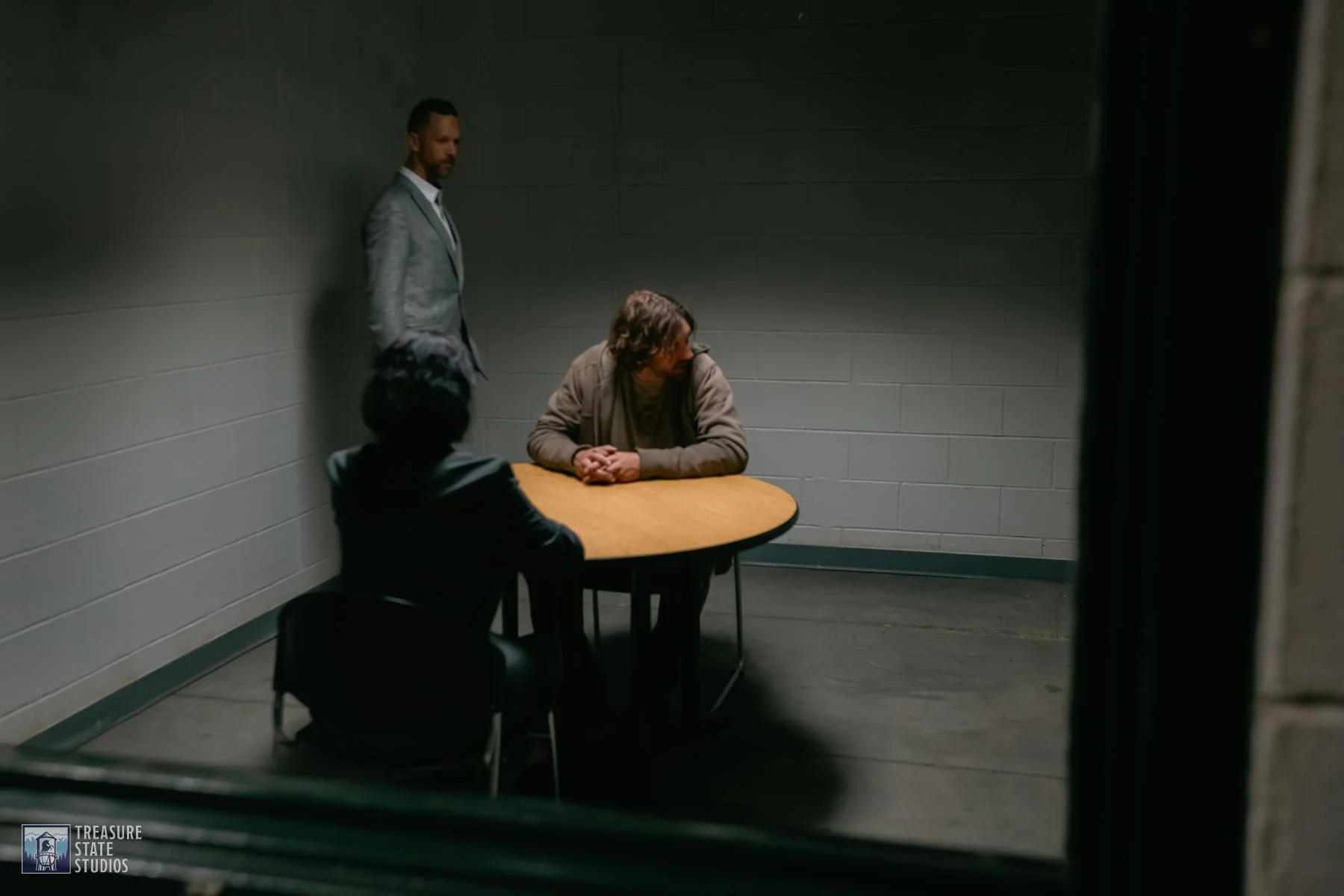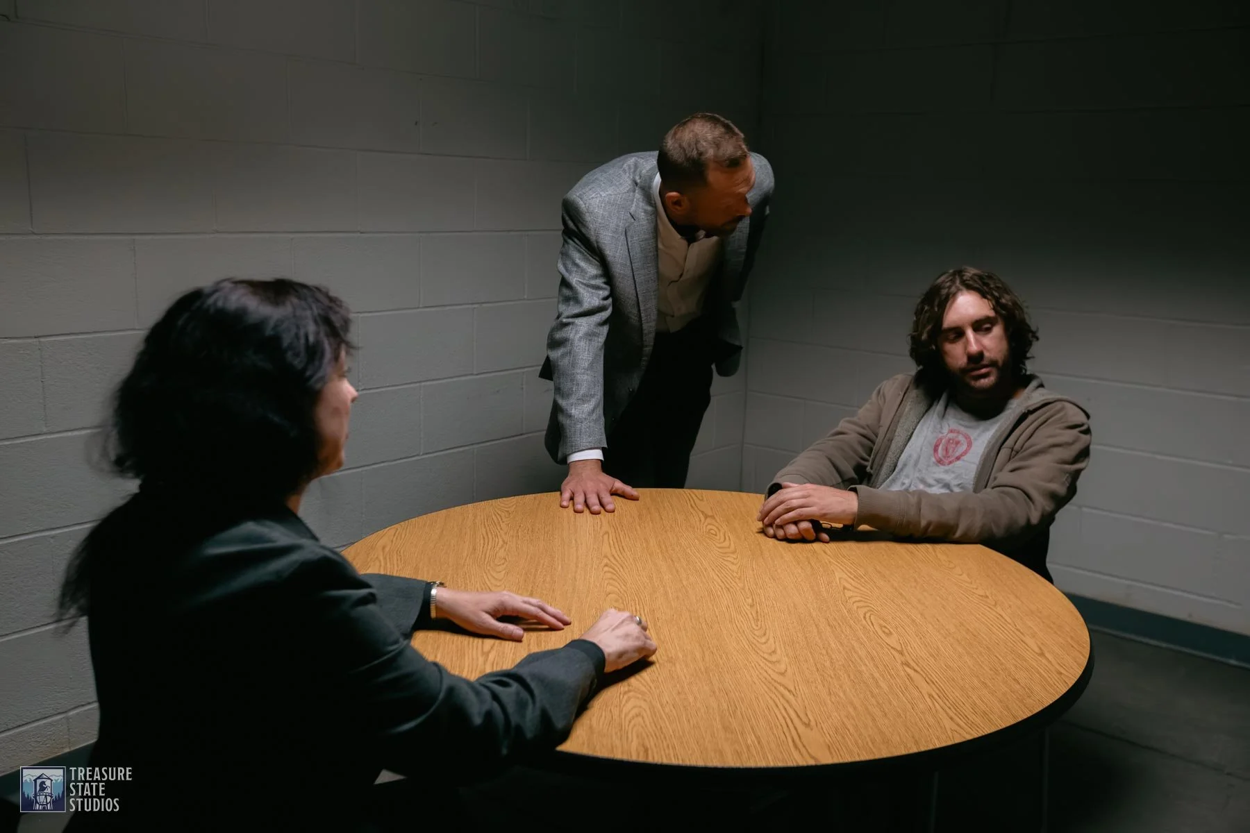 The interrogation room set captures the raw intensity of questioning, complete with authentic furnishings and lighting that heighten the tension between detective and suspect.