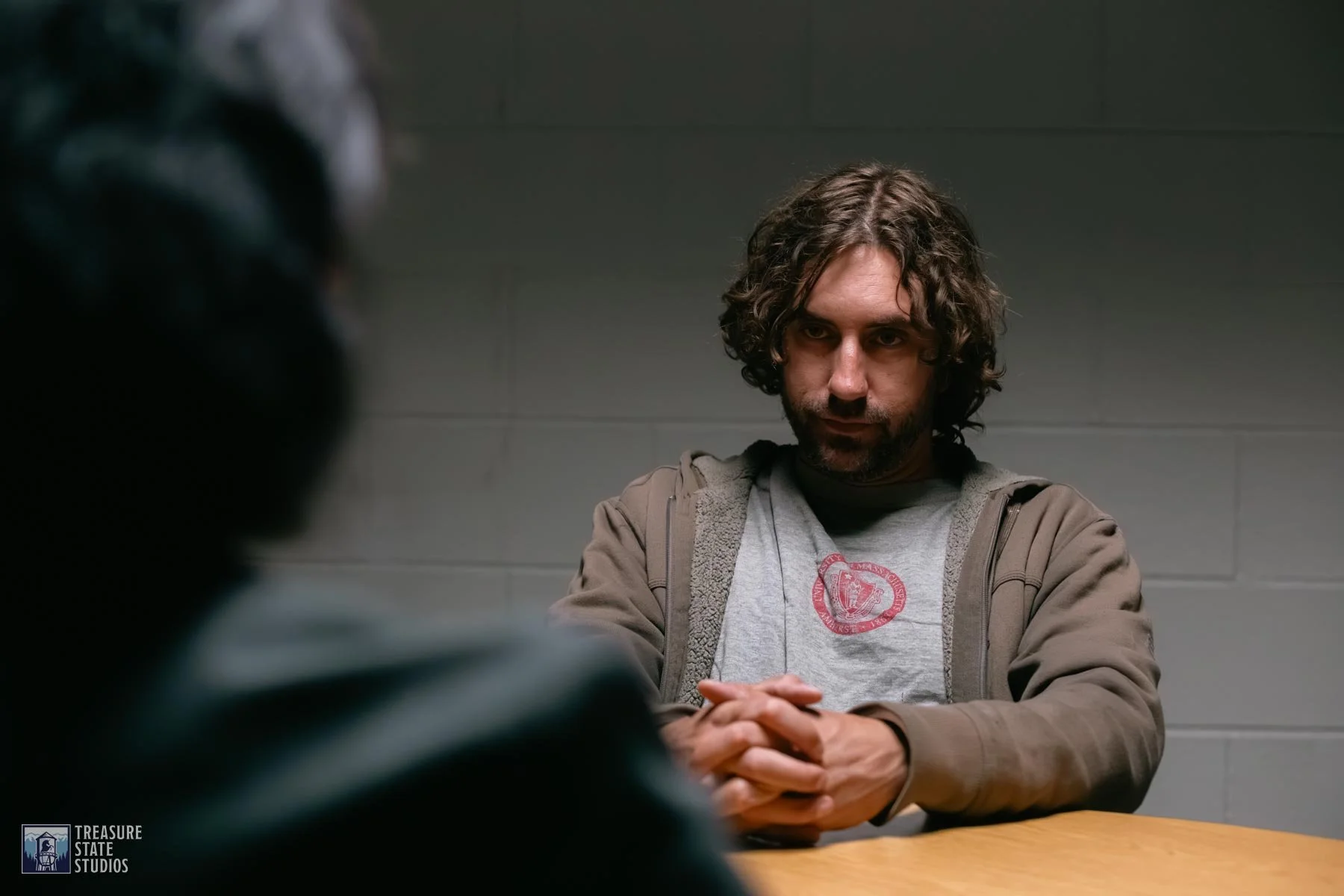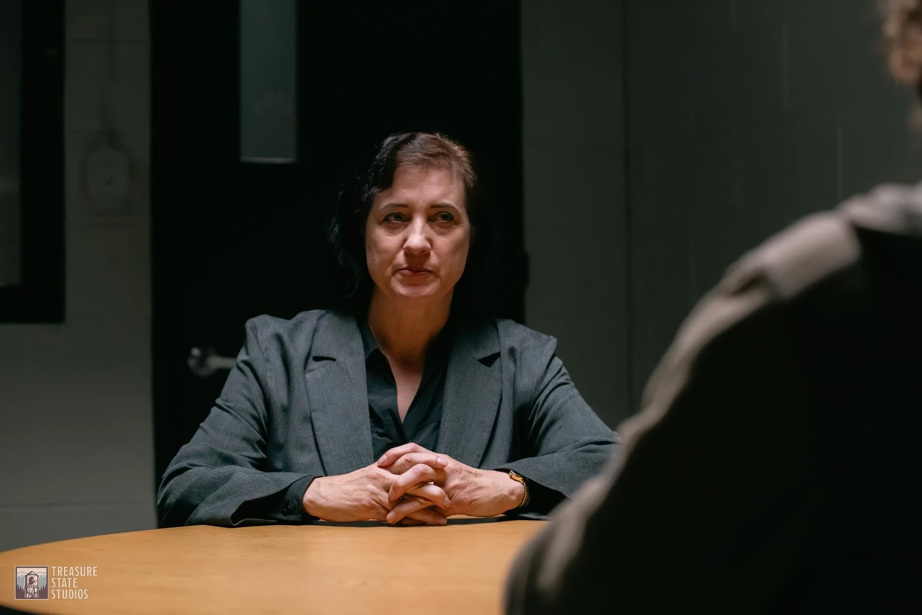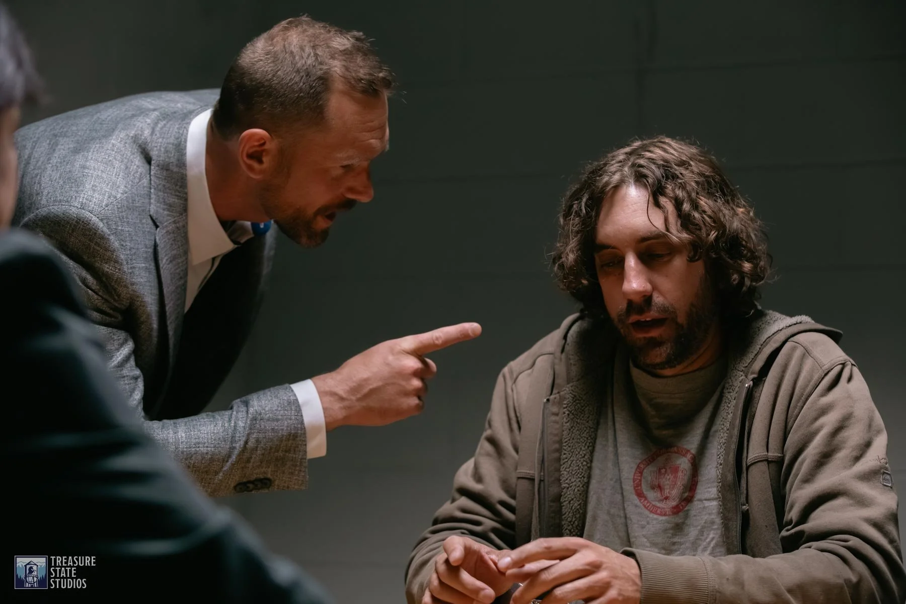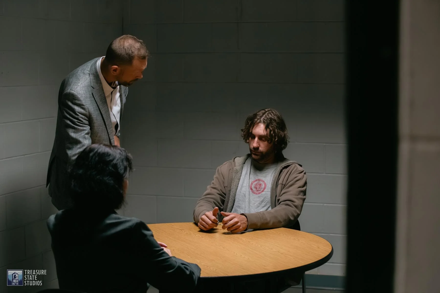 The interrogation room set captures the raw intensity of questioning, complete with authentic furnishings and lighting that heighten the tension between detective and suspect.